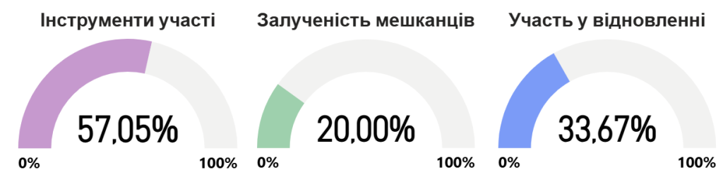 Найнижчий результат показав блок “Залученість мешканців” – лише 20,00%. Це критично важливий індикатор, який демонструє розрив між наявністю інструментів та їх фактичним використанням громадянами.