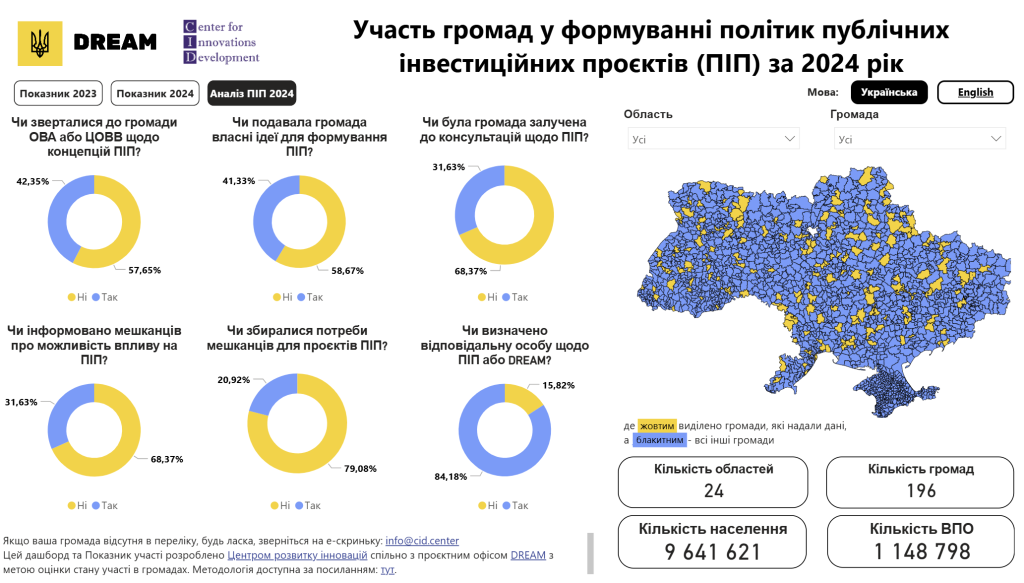 Дослідження участі територіальних громад у формуванні політик публічних інвестиційних проєктів за 2024 рік виявляє суттєвий розрив між організаційними можливостями громад та реальним залученням мешканців до процесу прийняття рішень. Більшість громад (84,18%) визначили відповідальних осіб за взаємодію щодо ПІП, що свідчить про інституційну готовність до співпраці на рівні місцевого самоврядування.